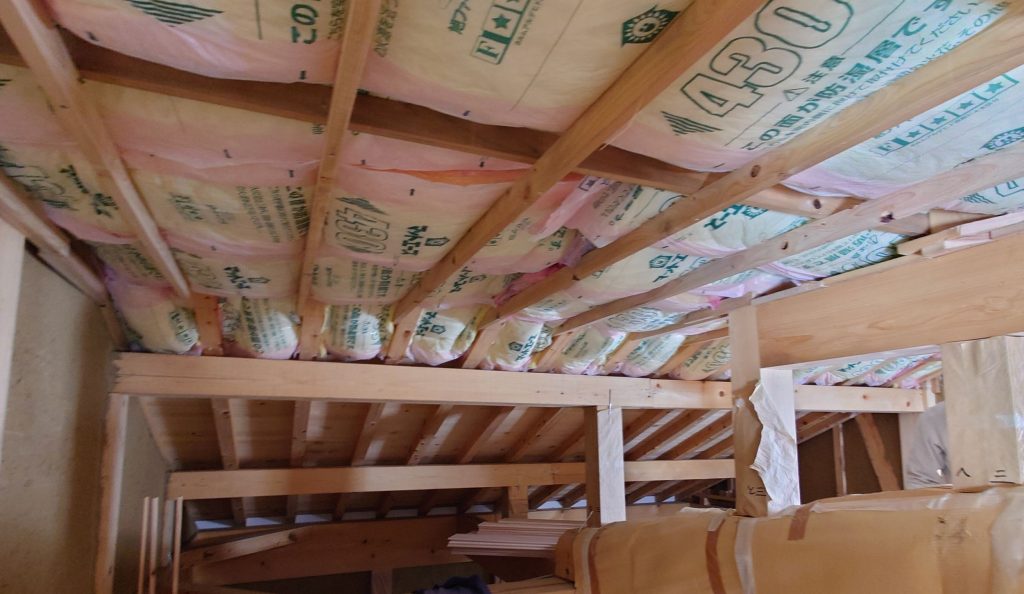 ダイニングの吹き抜け天井が張れました。桧の丁物、桧の丸太、桧の板、淡く薄い桧は優しさを感じさせ、光の届かない吹き抜けも鉋仕上げにより明るく光を反射させます。板は三河桧の上小節になります。明日は洋間の天井杉源平の柾板を貼りましょう。